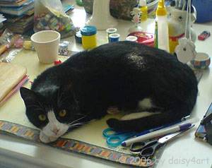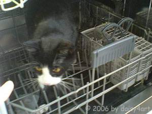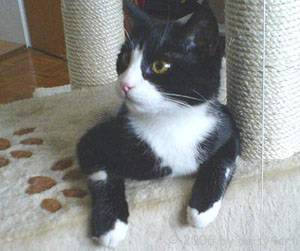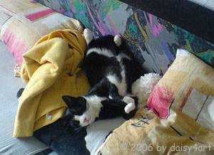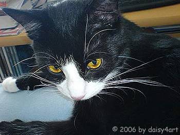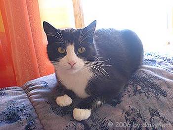 Mitte März 2006 waren meine Dosis im Tierheim in Höchstädt/Donau. Wahrscheinlich haben die sich nach einem zweiten Katz gesehnt, weil Mina ja schon umgezogen war. Sie brachten von da ein junges Katerle in schwarz-weiß mit. Der hat sich bei Dosine richtig eingeschmust, so sagen sie. Ich denke, er hat einfach das Leben im Tierheim satt gehabt und wollte raus, also hat er sich eingeschleimt und geschnurrt, was das Zeug hält ;-)) . Vielleicht wußte er ja, dass es ihm hier richtig gut geht.